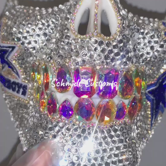 Turn heads with this bold, fully hand-blinged rhinestone mask featuring fierce crystal “fang” teeth and iconic blue star accents. Perfect for game days, photoshoots, performances, or anyone who loves luxury sparkle with attitude. One-of-a-kind and unforgettable!