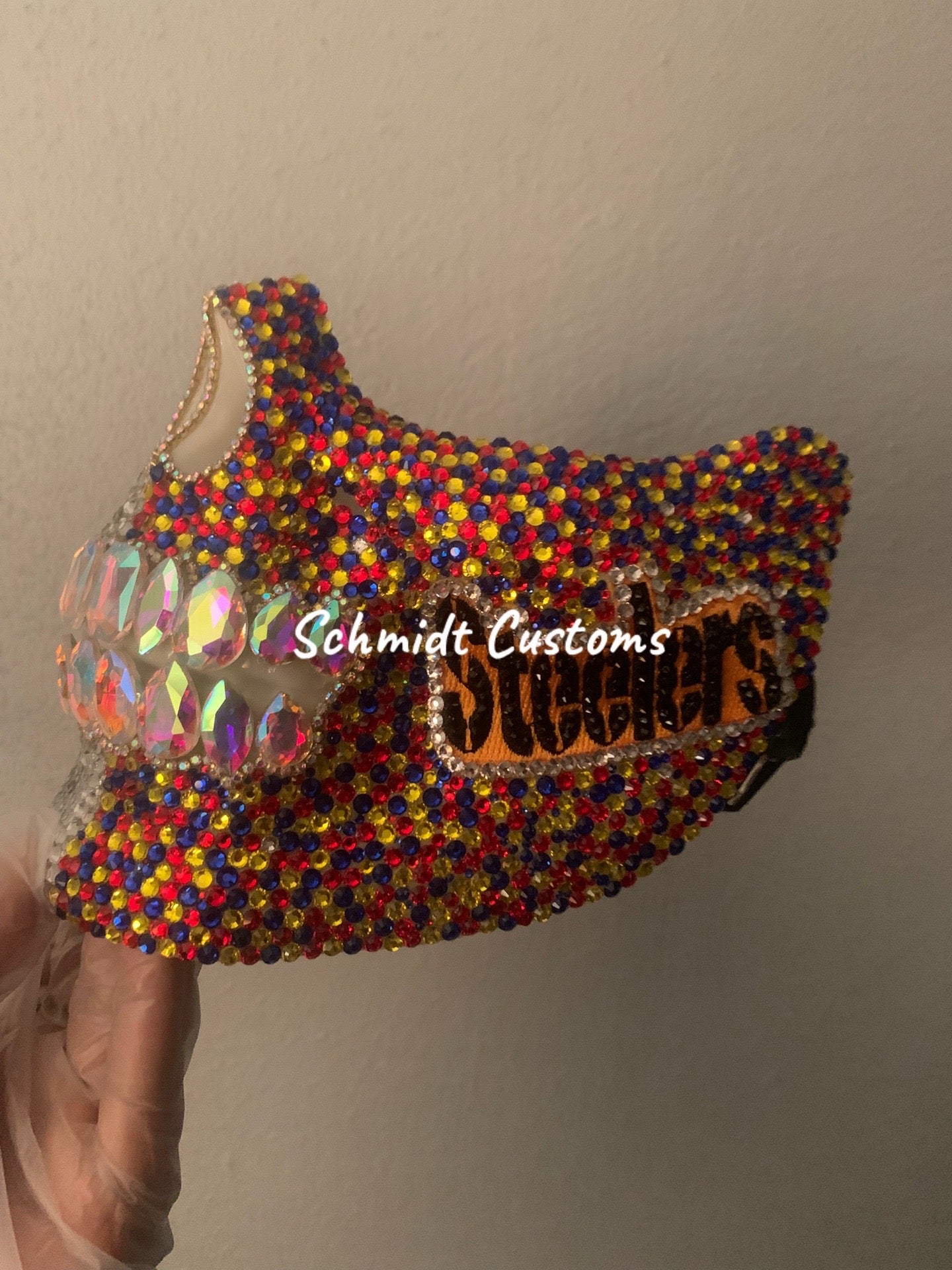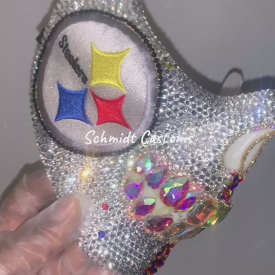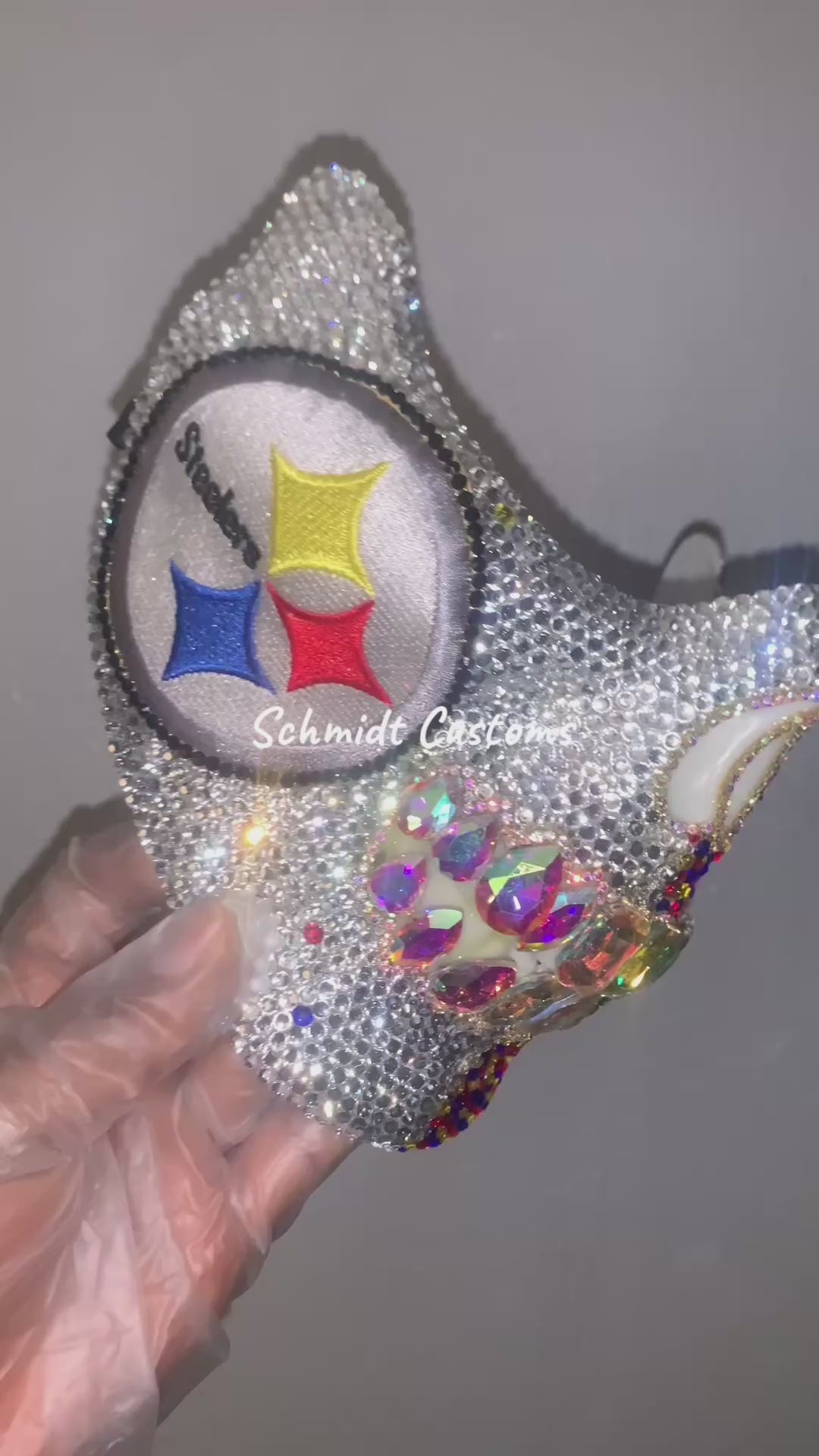 Turn heads with this one-of-a-kind, hand-crafted Steelers-inspired rhinestone skull mask. Drenched in sparkling crystals and bold gem teeth, it’s the ultimate statement piece for die-hard fans who love to shine. Perfect for game days, events, or collectibles!