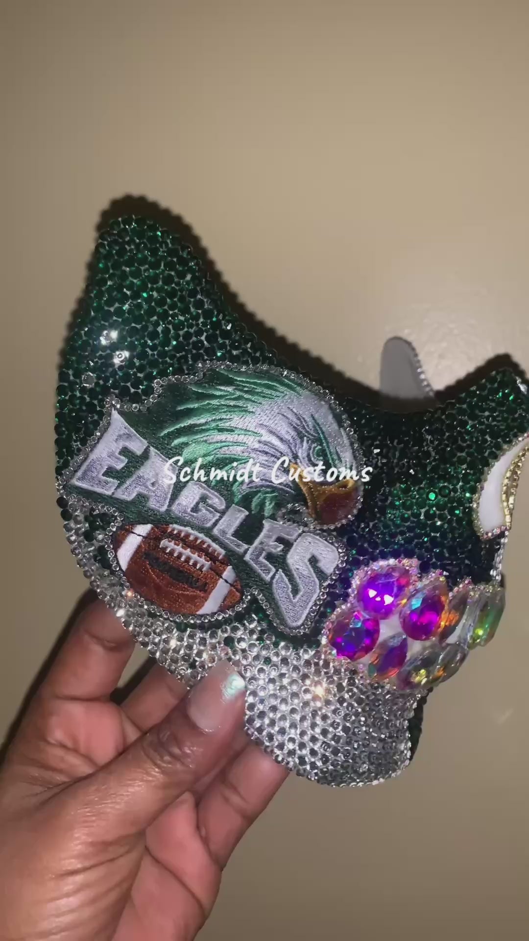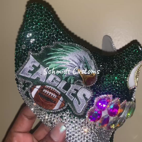 Rep your team in ultimate style! This handmade Philadelphia Eagles mask is fully covered in dazzling crystals with bold Eagle logos and radiant gem “teeth” for a head-turning game day or collector’s piece. Perfect for true Eagles fans who shine bright! Grab yours today!